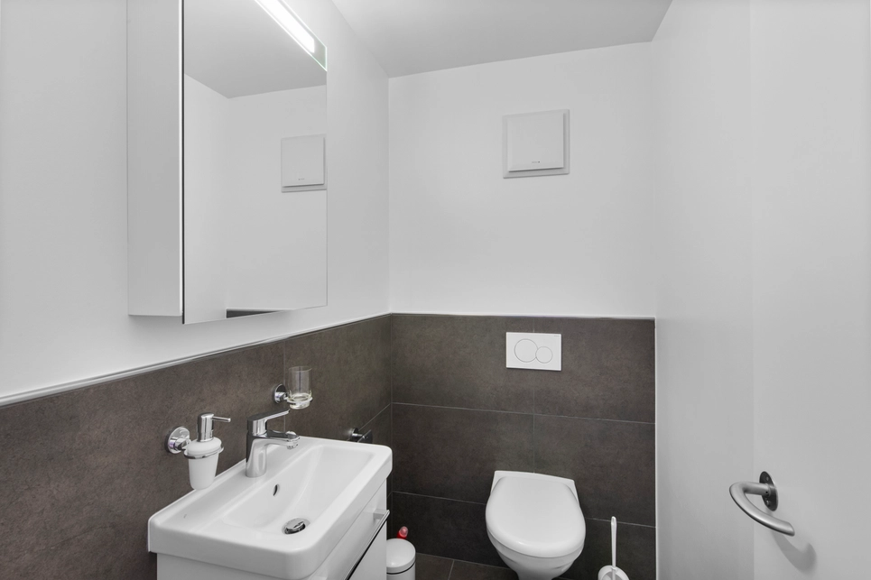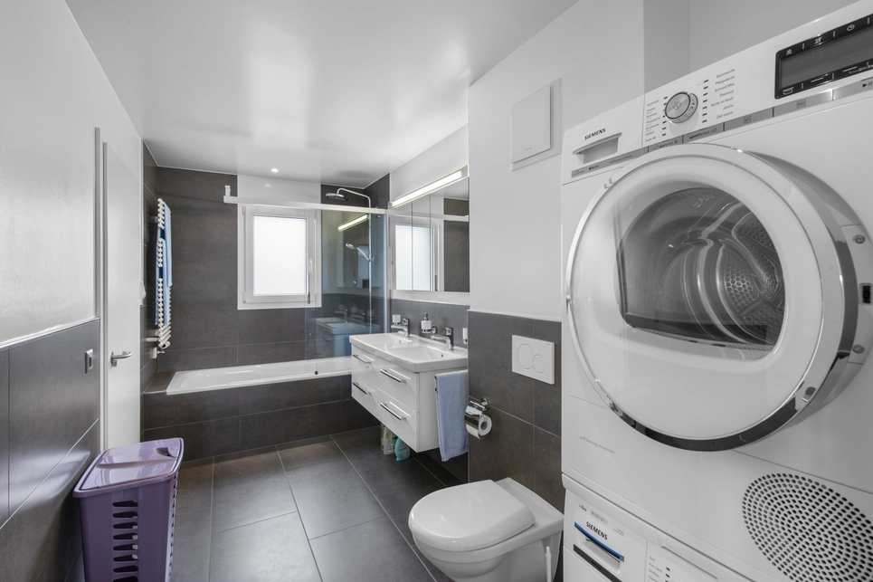 La salle-de-bains dispose d’une grande baignoire de 180cm, un lavabo double ainsi qu’une pharmacie éclairée, de même qu’une colonne de lavage Siemens.